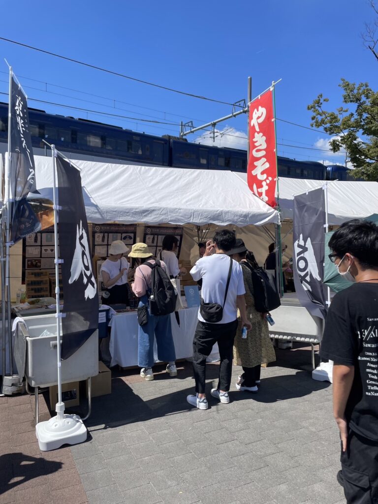 地元の飲食店などと共にオフィシャル&コラボ商品を販売する物販エリアは早々に行列を見せ、